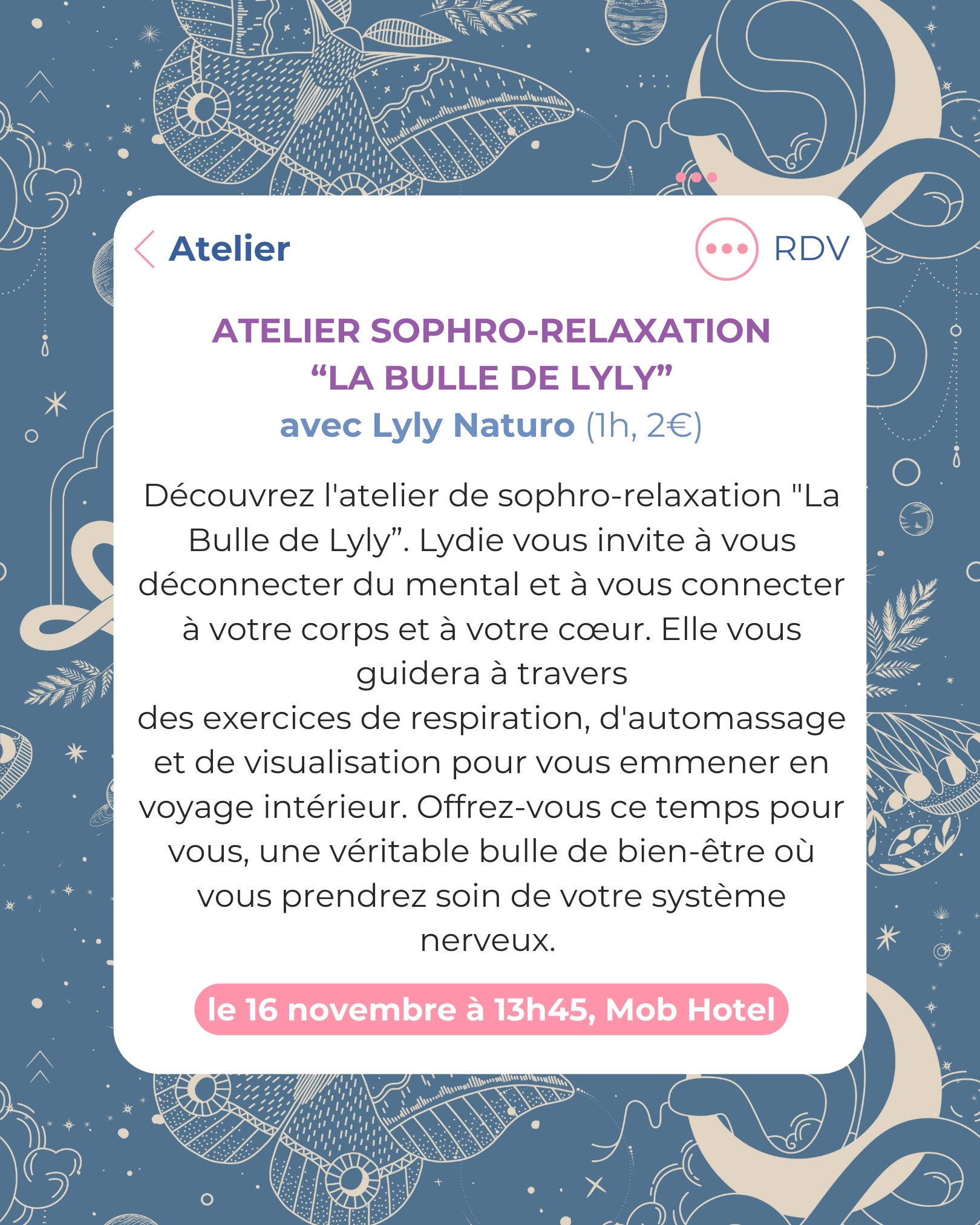 Découvrez l’atelier de sophro-relaxation « La Bulle de Lyly”. Lydie vous invite à vous déconnecter du mental et à vous connecter à votre corps et à votre cœur. Elle vous guidera à travers