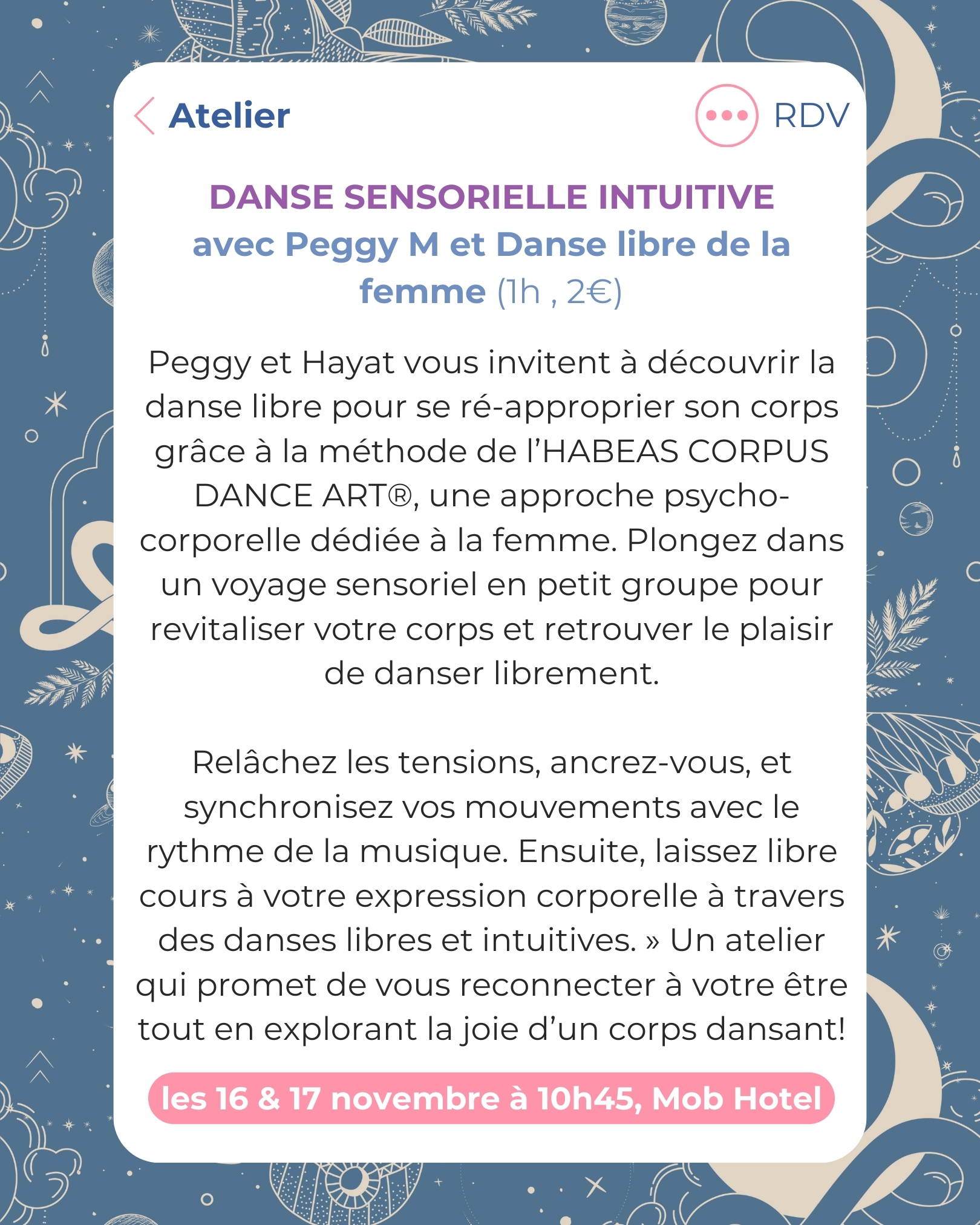Peggy et Hayat vous invitent à découvrir la danse libre pour se ré-approprier son corps grâce à la méthode de l’HABEAS CORPUS DANCE ART®️, une approche psycho-corporelle dédiée à la femme. Plongez dans un voyage sensoriel en petit groupe pour revitaliser votre corps et retrouver le plaisir de danser librement.