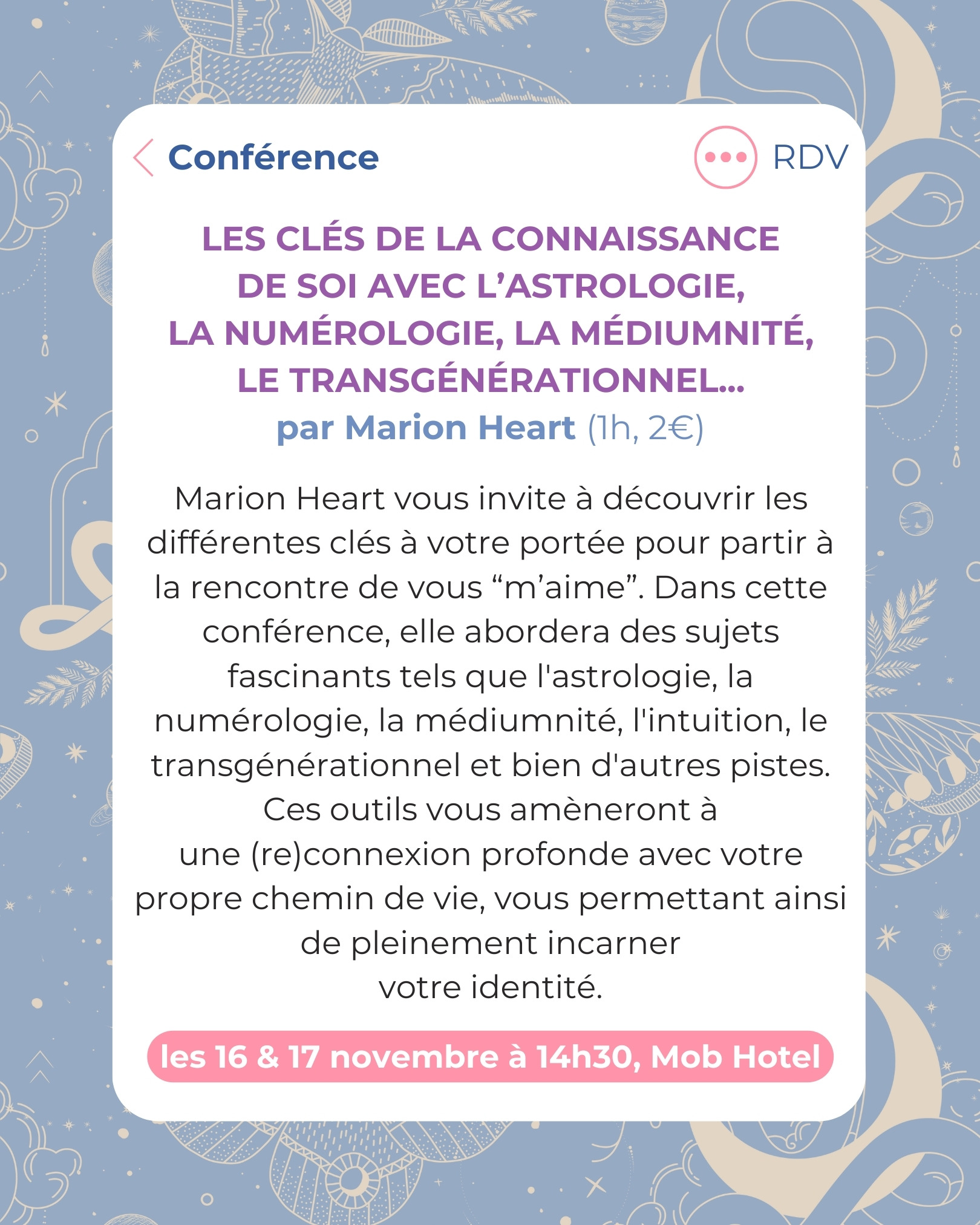 Marion Heart vous invite à découvrir les différentes clés à votre portée pour partir à la rencontre de vous “m’aime”. Dans cette conférence, elle abordera des sujets fascinants tels que l’astrologie, la numérologie, la médiumnité, l’intuition, le transgénérationnel et bien d’autres pistes.