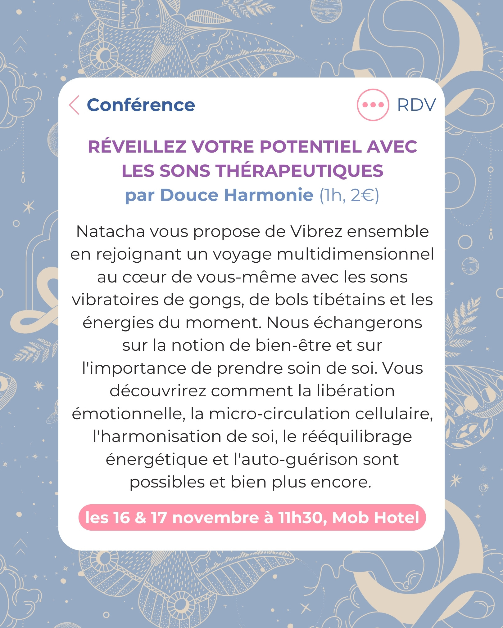 Natacha vous propose de Vibrez ensemble en rejoignant un voyage multidimensionnel au cœur de vous-même avec les sons vibratoires de gongs, de bols tibétains et les énergies du moment.