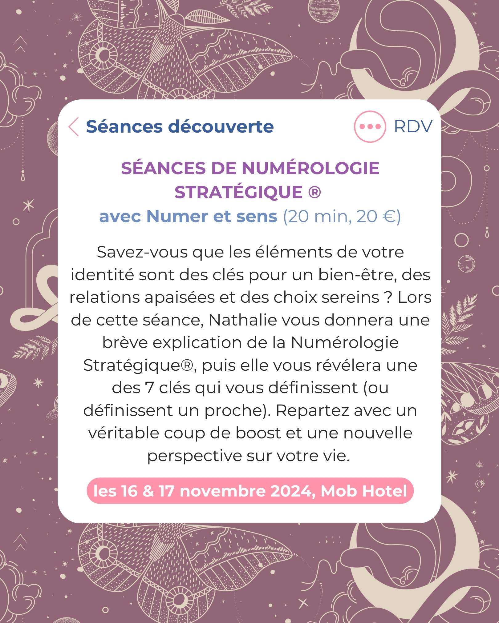 Savez-vous que les éléments de votre identité sont des clés pour un bien-être, des relations apaisées et des choix sereins ? Lors de cette séance, Nathalie vous donnera une brève explication de la Numérologie Stratégique®️, puis elle vous révélera une des 7 clés qui vous définissent (ou définissent un proche). Repartez avec un véritable coup de boost et une nouvelle perspective sur votre vie.